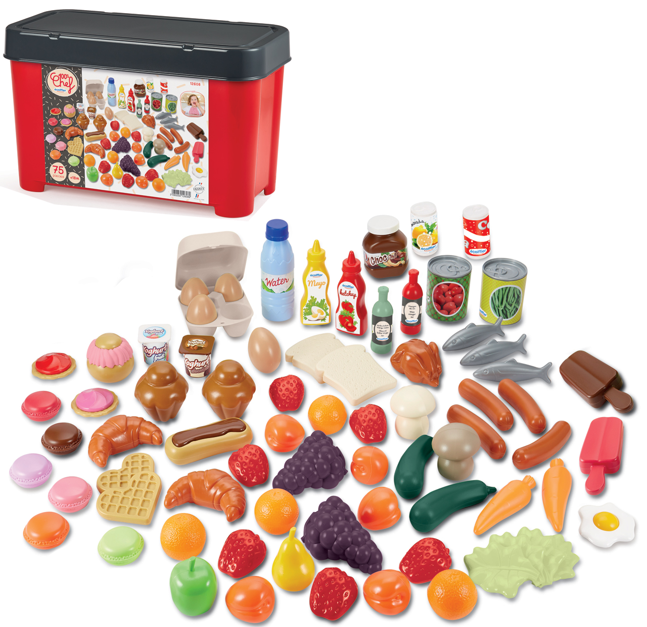 Ein großes Set... Auf zur großen Spielparty mit dem 75-teiligen Spiellebensmittel-Set aus der 100% Chef-Linie von Ecoiffier. Das umfangreiche Set umfasst von Obst, Gemüse bis hin zu süßen Leckereien, Würstchen, Fisch, Getränken und Dosen alles, wa...