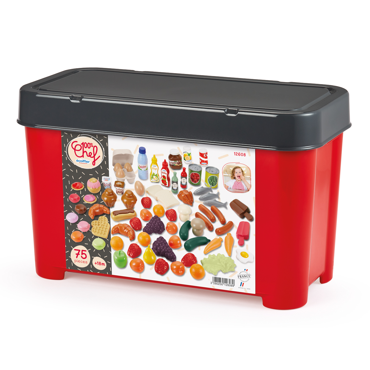 Auf zur großen Spielparty mit dem 75-teiligen Spiellebensmittel-Set aus der 100% Chef-Linie von Ecoiffier. Das umfangreiche Set umfasst von Obst, Gemüse bis hin zu süßen Leckereien, Würstchen, Fisch, Getränken und Dosen alles, was das Herz kleiner Kaufleute begehrt. So können Kaufmannsladen oder Spielküche ideal befüllt und ergänzt werden! Nach dem Spielen lassen sich alle Accessoires ganz einfach in der praktischen Box aufbewahren. Griffig und ohne scharfe Kanten ist das Spiel-Zubehör bereits für Kinder ab 18 Monaten geeignet. Hergestellt aus hochwertigem Kunststoff in Frankreich.