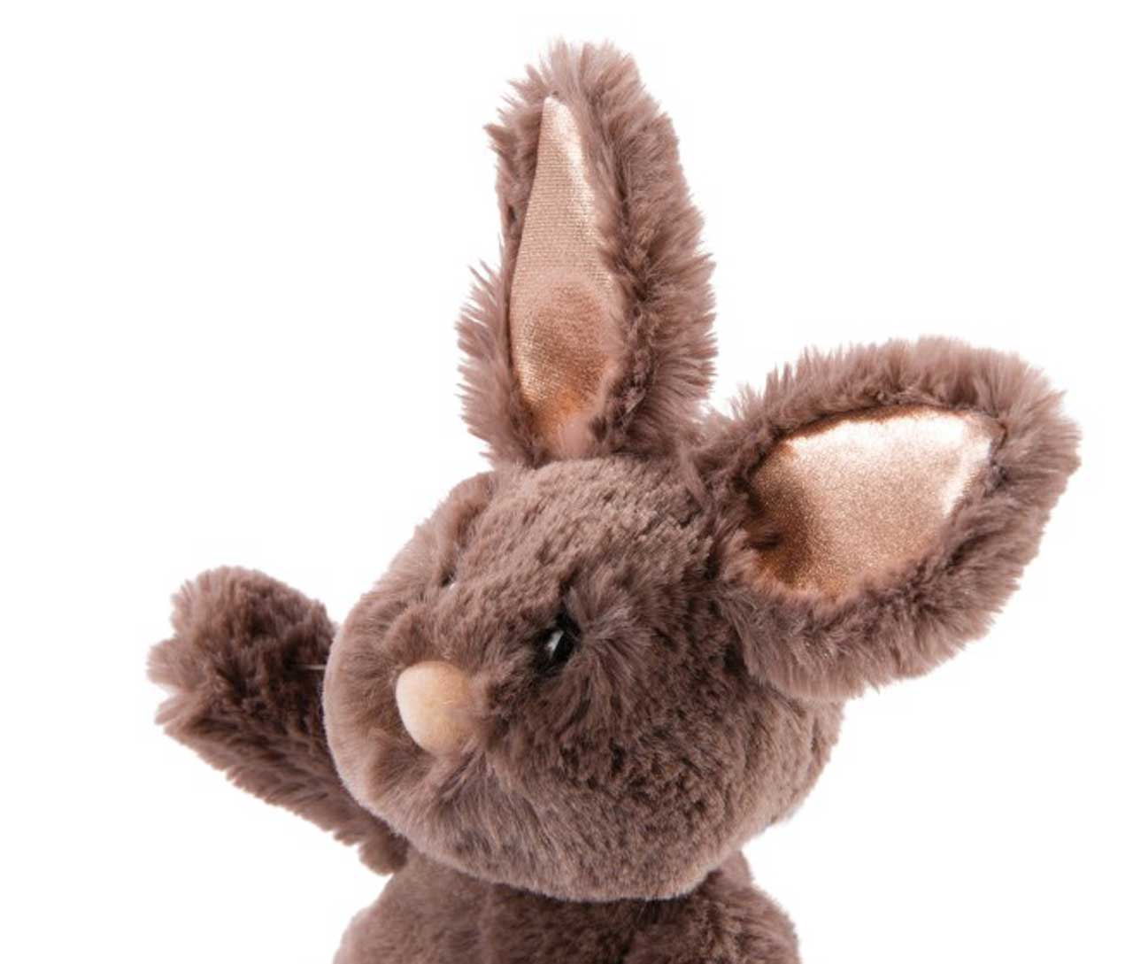 Ein knuffier, kleiner Freund... Wer hoppelt sich denn da in dein Herz? Dem dunkelbraunen Kuschelhasen mit seinen großen Flauscheohren, die mit goldglänzendem Stoff ausgefüttert sind, kann garantiert niemand widerstehen. Er ist einfach zum Liebhabe...