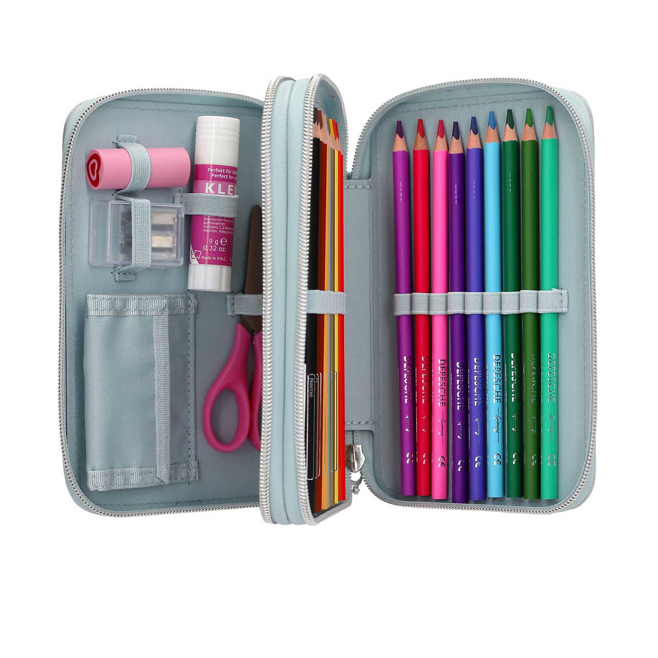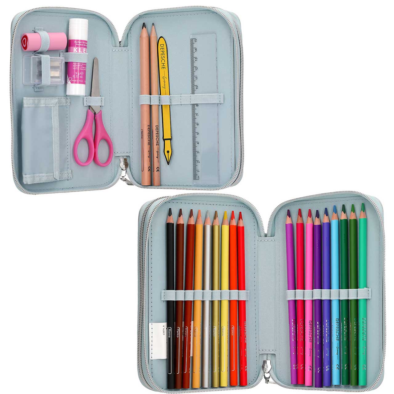 Komplett gefüllt mit Stiften & Co. ... Die 2-Fach-Federtasche in blassem Hellblau mit zauberhaft zartem Pferdemotiv auf der Front lädt zum Träumen ein. Die beiden Reißverschlussfächer sind komplett gefüllt mit 18 Buntstiften, Radierer, Schere,...