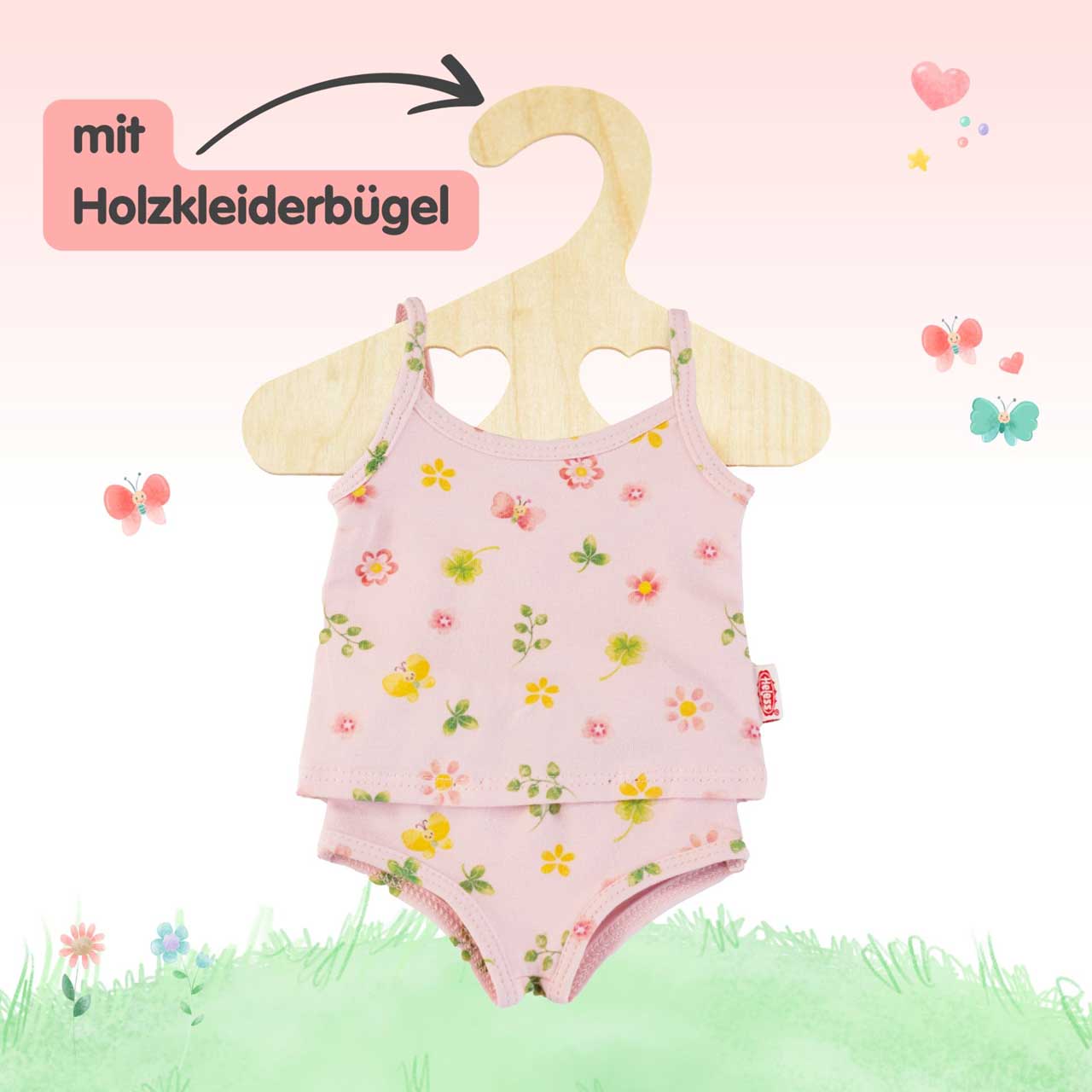 Für Kinderhände gemacht: Das weiche und elastische Material sorgt dafür, dass die Puppen-Unterwäsche kinderleicht an- und ausgezogen werden kann. Die hochwertige Verarbeitung sichert langanhaltenden Spielspaß. Die Puppen-Unterwäsche passt den meisten marktgängigen Puppen der Größe 28-35 cm. Sie ist auch in einer weiteren Ausführung für Puppengröße 35-45 cm erhältlich. Der Artikel wird auf einem Holzkleiderbügel geliefert. Das Set besteht aus 95 % Baumwolle, 5 % Elasthan. Die Puppe gehört nicht zum Lieferumfang.