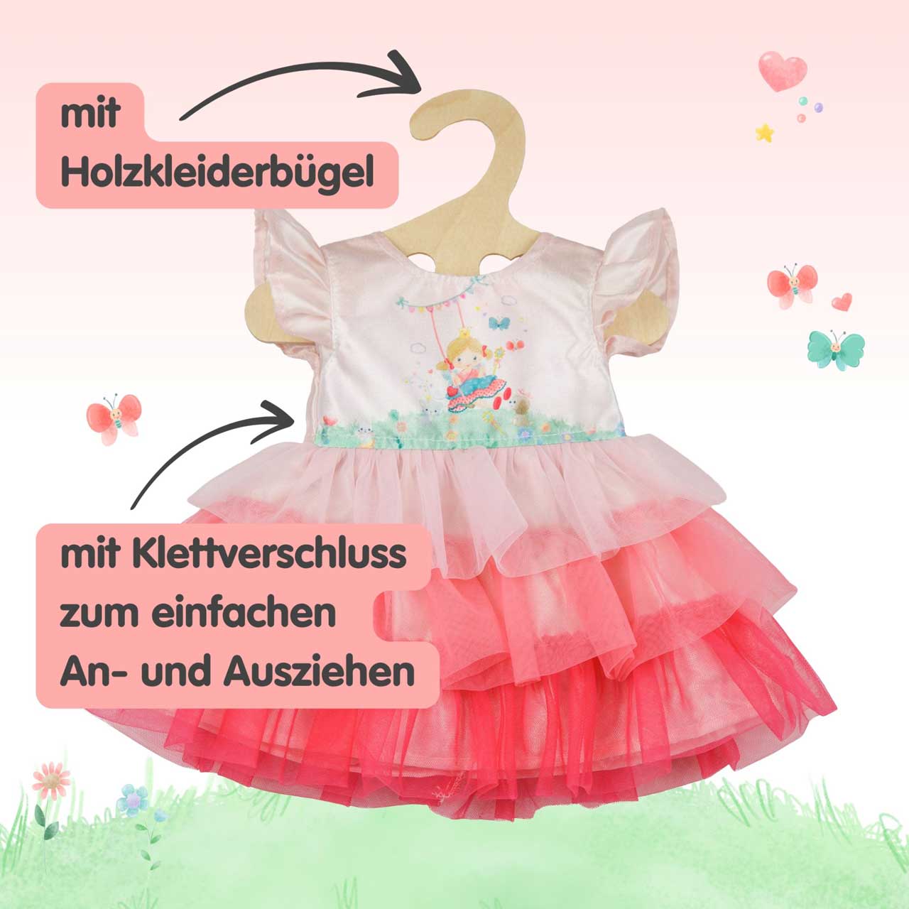 Traumhaft schön... Das wunderschöne Puppenkleid Prinzessin Emily verwandelt Deine Puppe in eine bezaubernde Schönheit. Das zartrosa schimmernde Oberteil ist mit der niedlichen Prinzessin Emily bedruckt, die in ihrer Zauberwelt luftig-leicht auf ih...