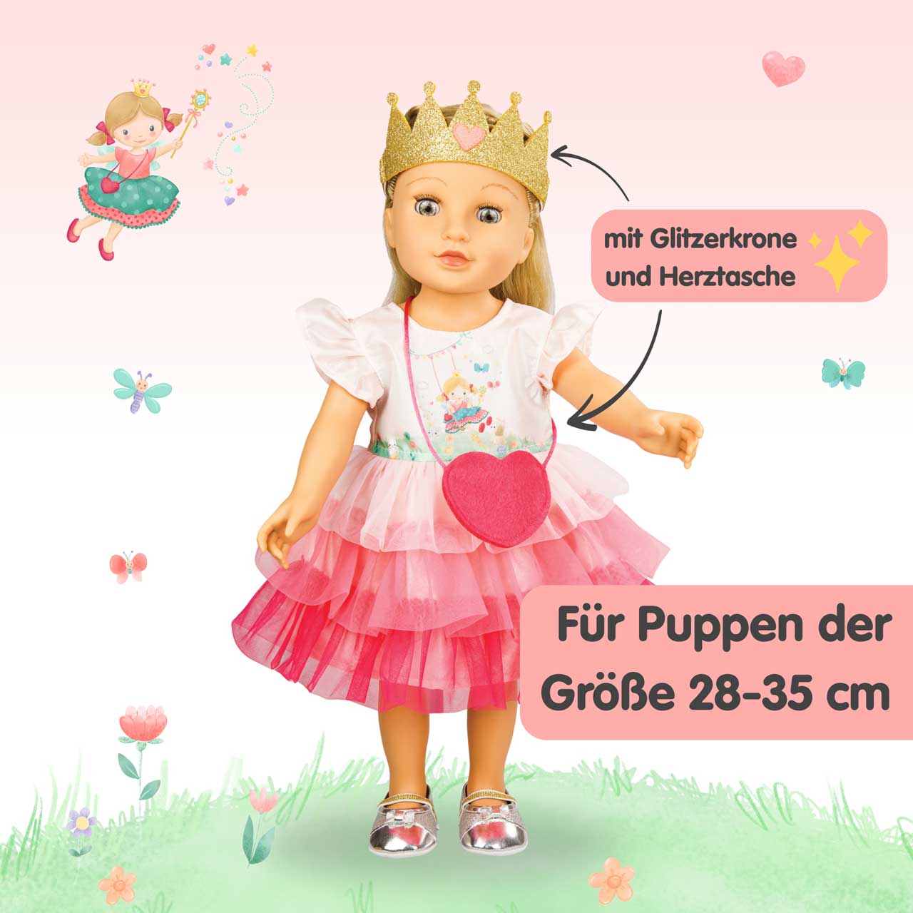 HELESS® Puppenkleid Prinzessin Emily mit Herztasche und Krone Gr. 28-35 cm