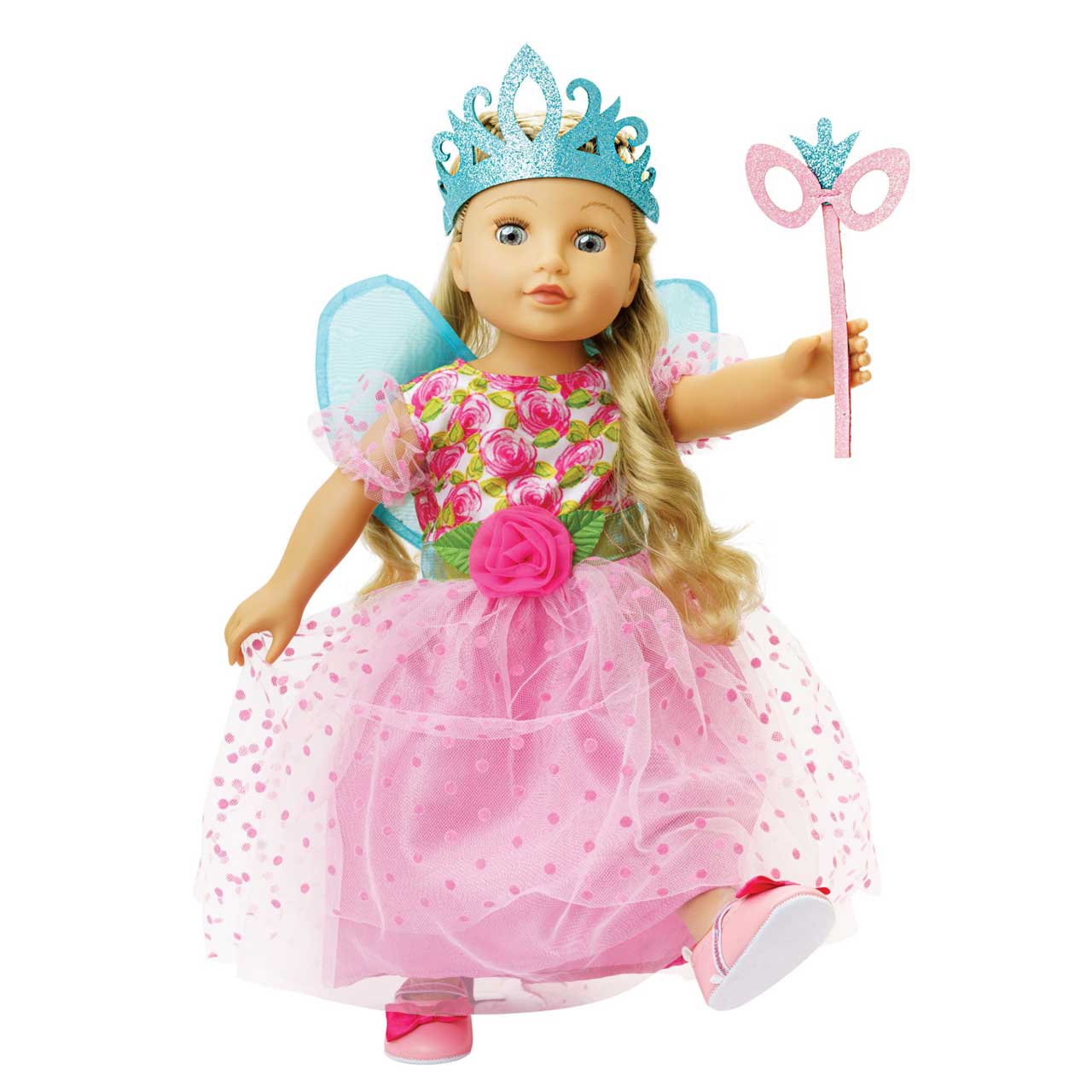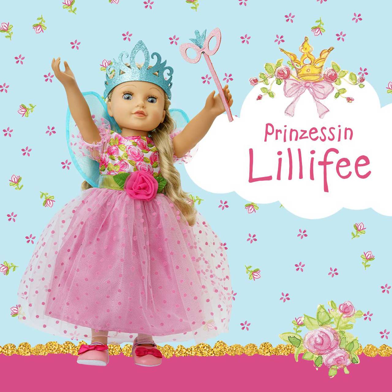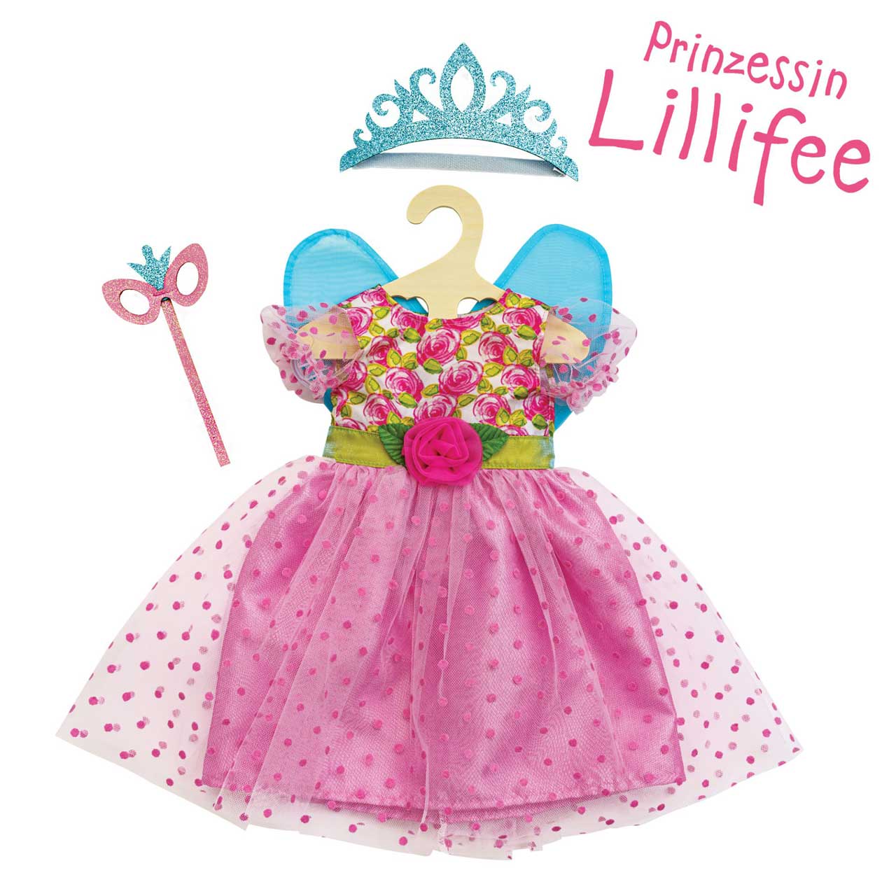 HELESS® Puppenkleid Prinzessin Lillifee mit Glitzerkrone und Augenmaske Gr. 35-45 cm
