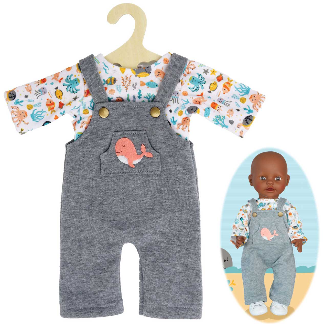 Ein tolles Set... Die Puppen-Latzhose mit T-Shirt Wal Bobby von Heless zaubert Puppeneltern sofort ein großes Lächeln ins Gesicht. Während Wal Bobby auf der gemütlichen, graumelierten Latzhose als hochwertige Bestickung planscht, schwimmt er auf d...