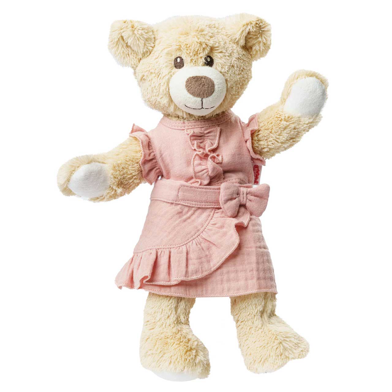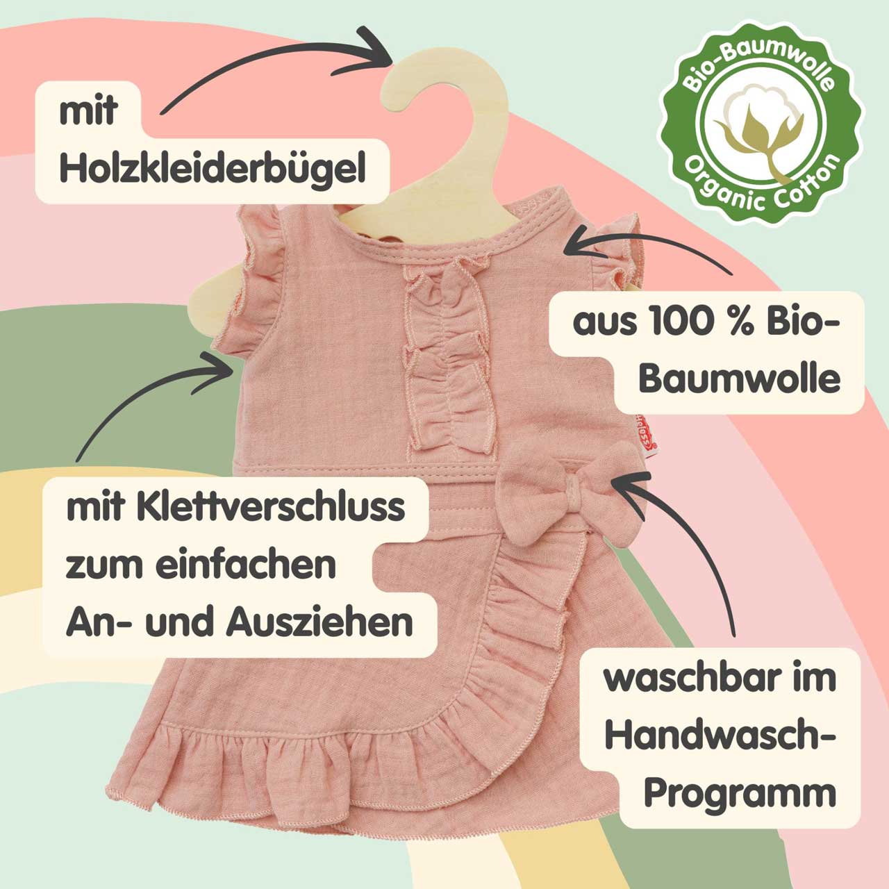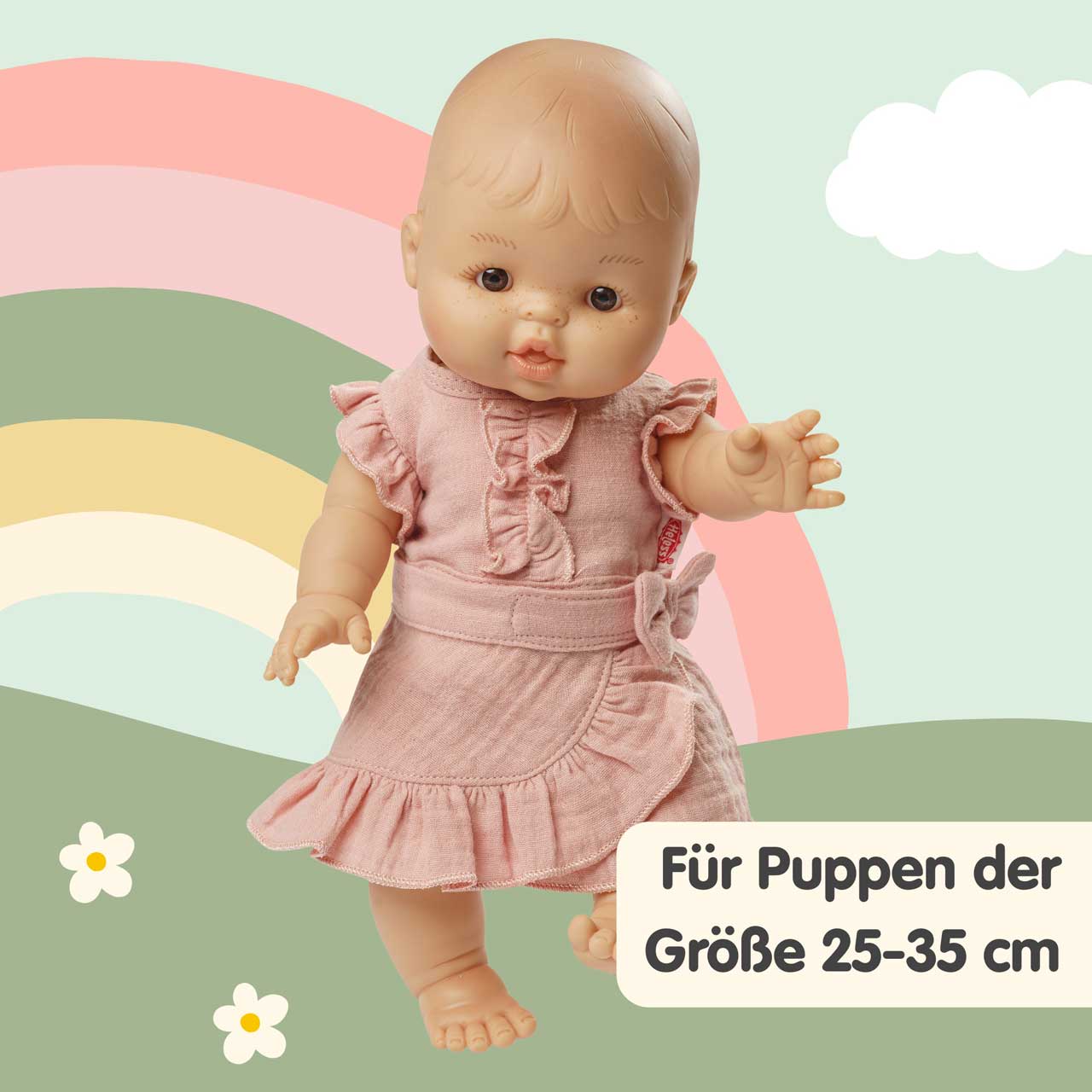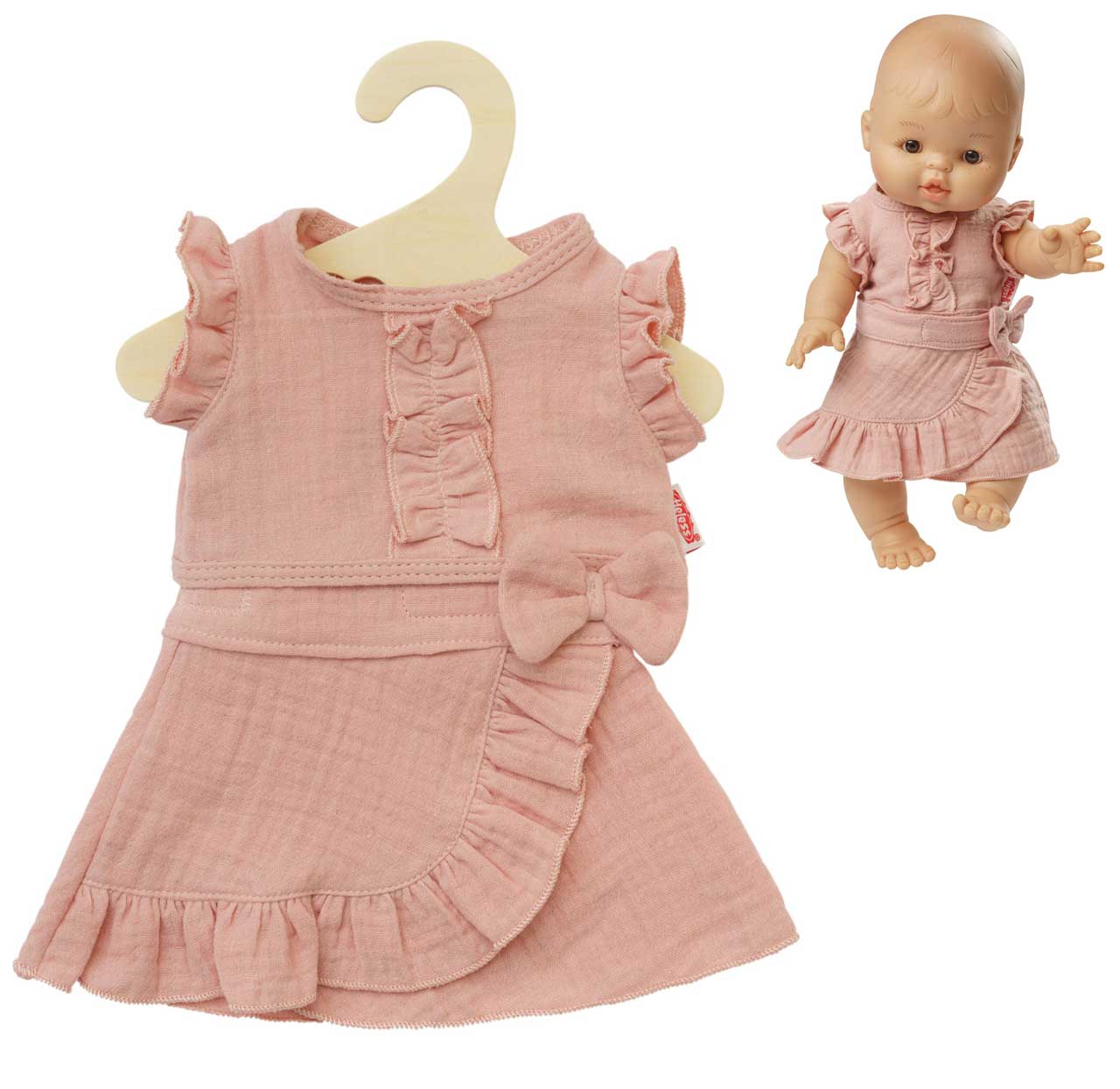 Ein Puppenoutfit in liebevollem Design, das durch seine sanfte Farbe, höchste Qualität und niedliche Rüschenelemente besticht. Die Klettverschlüsse an Top und Rock sorgen dafür, dass das Puppenoutfit kinderleicht an- und ausgezogen werden kann. Das Kleid passt den meisten marktgängigen Puppen der Größe 28-35 cm. Es ist auch in einer weiteren Ausführung für Puppengröße 35-45 cm erhältlich. Der Artikel wird auf einem Holzkleiderbügel geliefert. Die Puppe gehört niht zum Lieferumfang.