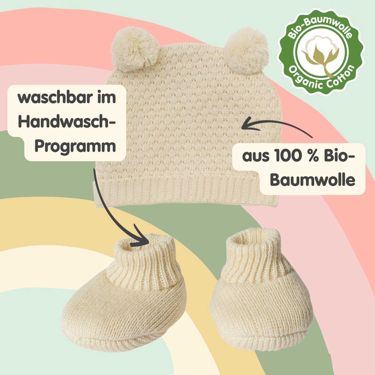 Dieses Strickset aus 100 % Bio-Baumwolle von Heless besteht aus Mütze und Strickschuhen und ist eine ideale Ergänzung zum Puppen-Strickstrampler. Es lässt sich aber auch mit vielen anderen Puppenoutfits der Heless-Kollektion wunderschön kombinieren.