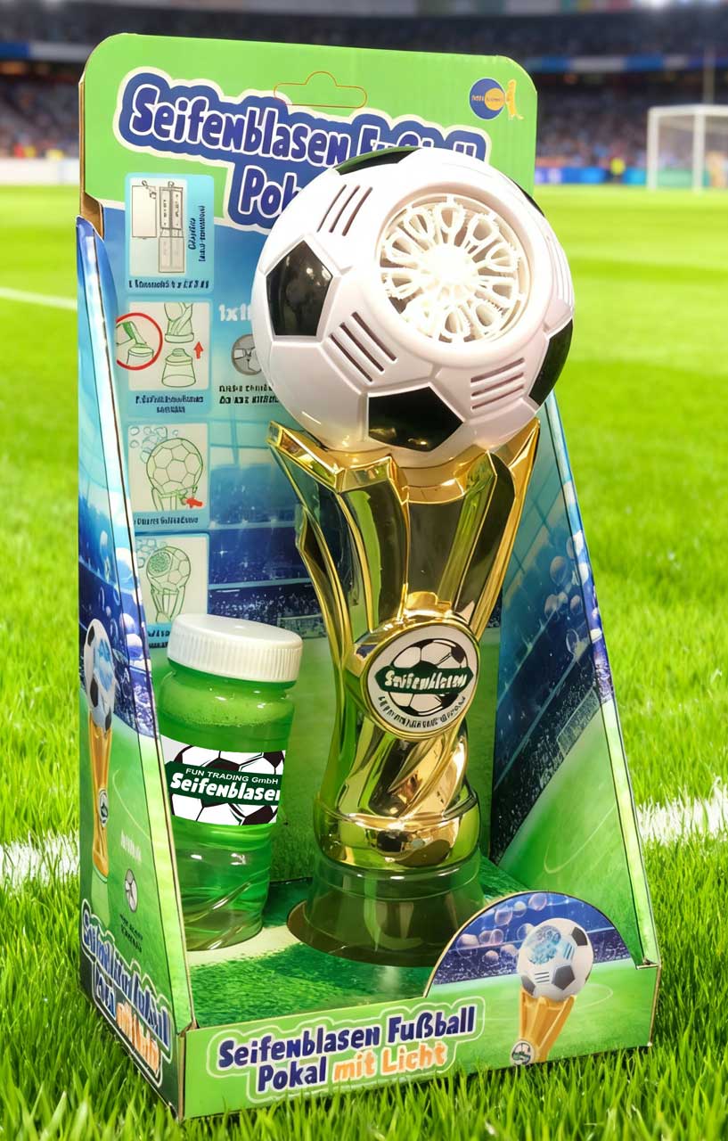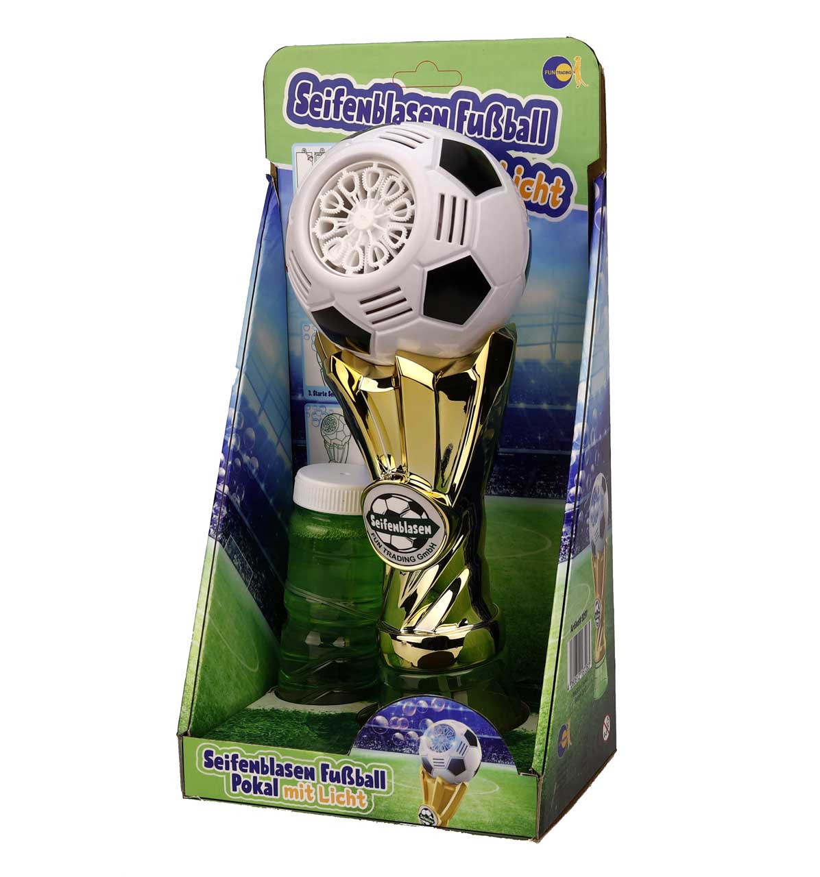 Hol dir das Stadionfeeling direkt nach Hause! Ob zur EM / WM, zur Vereinsmeisterschaft oder als Highlight auf Kindergeburtstagen - dieses Produkt kennt keine Nebensaison. Dieser goldene Pokal ist das ultimative Must-have für alle kleinen Kicker und großen Fans, die den Sieg gebührend feiern wollen. Es sind 110 ml Seifenblasenflüssigkeit enthalten. Es werden 4x AA Batterien benötigt, die nicht im Lieferumfang enthalten sind.