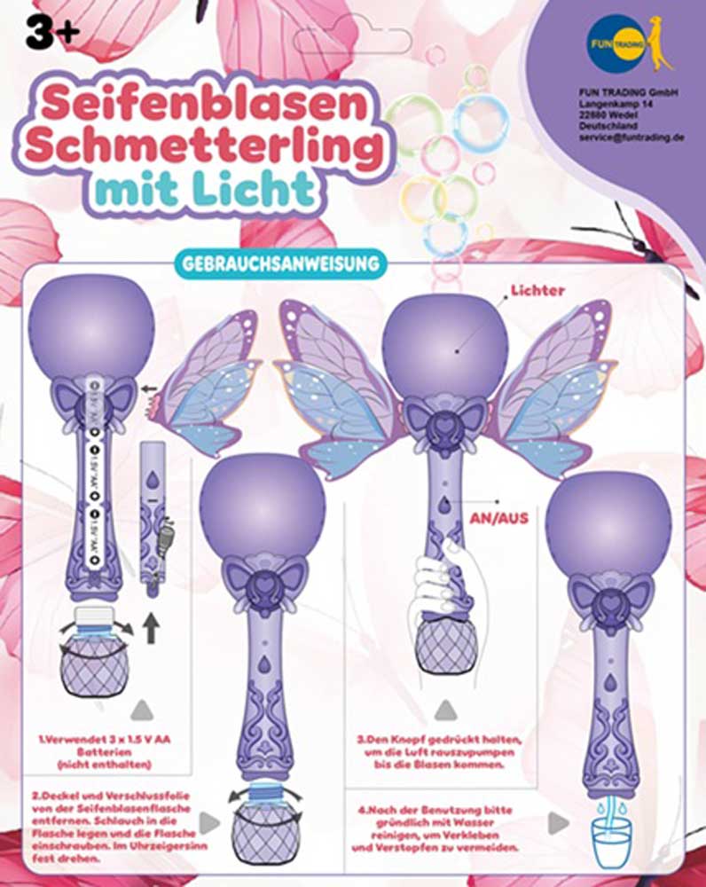 Der Schmetterling, der den Garten verzaubert. Einfach auffüllen, auf den Knopf drücken und zusehen, wie die bunten Blasen mit dem Schmetterling um die Wette fliegen. Tolle LED Lichter machen den Spielspaß perfekt. Es sind 100 ml Seifenblasenflüssigkeit enthalten. Es werden 3x AA Batterien benötigt, die nicht im Lieferumfang enthalten sind.