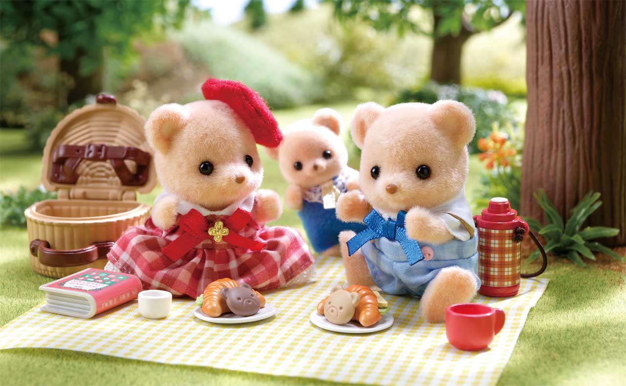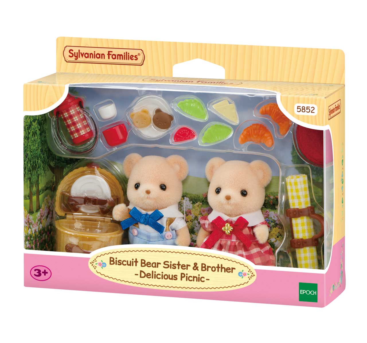 Auf ins Freie mit dem Biscuit Bären Geschwister Picknickspaß von Sylvanian Families. Die beiden samtig-weichen Bärenkinder Theo und Molly freuen sich auf einen leckeren Ausflug ins Grüne. Theo ist ein sanfter, höflicher Junge und träumt davon einmal ein großer Detektiv zu werden. Molly liebt Bücher und nimmt zu jedem Picknick ein paar Lieblingsgeschichten mit. Theo und Molly tragen niedliche handgemachte Outfits zum An- und Ausziehen. Das detailreiche Zubehör hat viele Funktionen: Aus Croissants werden mit Füllungen im Handumdrehen leckere Sandwiches, die Picknickdecke kann zusammengerollt und in der Halterung verstaut werden und es gibt süße bärenförmige Kekse. Das Geschirr, die Sandwiches und Kekse passen in den Picknickkorb, den Bruder oder Schwester tragen können. Die Trinkflasche mit Becher und die karierte Decke runden den Picknicklook ab. In Kombination mit der Biscuit Bären Familie und den Biscuit Bären Zwillingen (5851, 5853, separat erhältlich) macht der Picknickspaß mit der ganzen Biscuit Bären Familie noch mehr Freude.