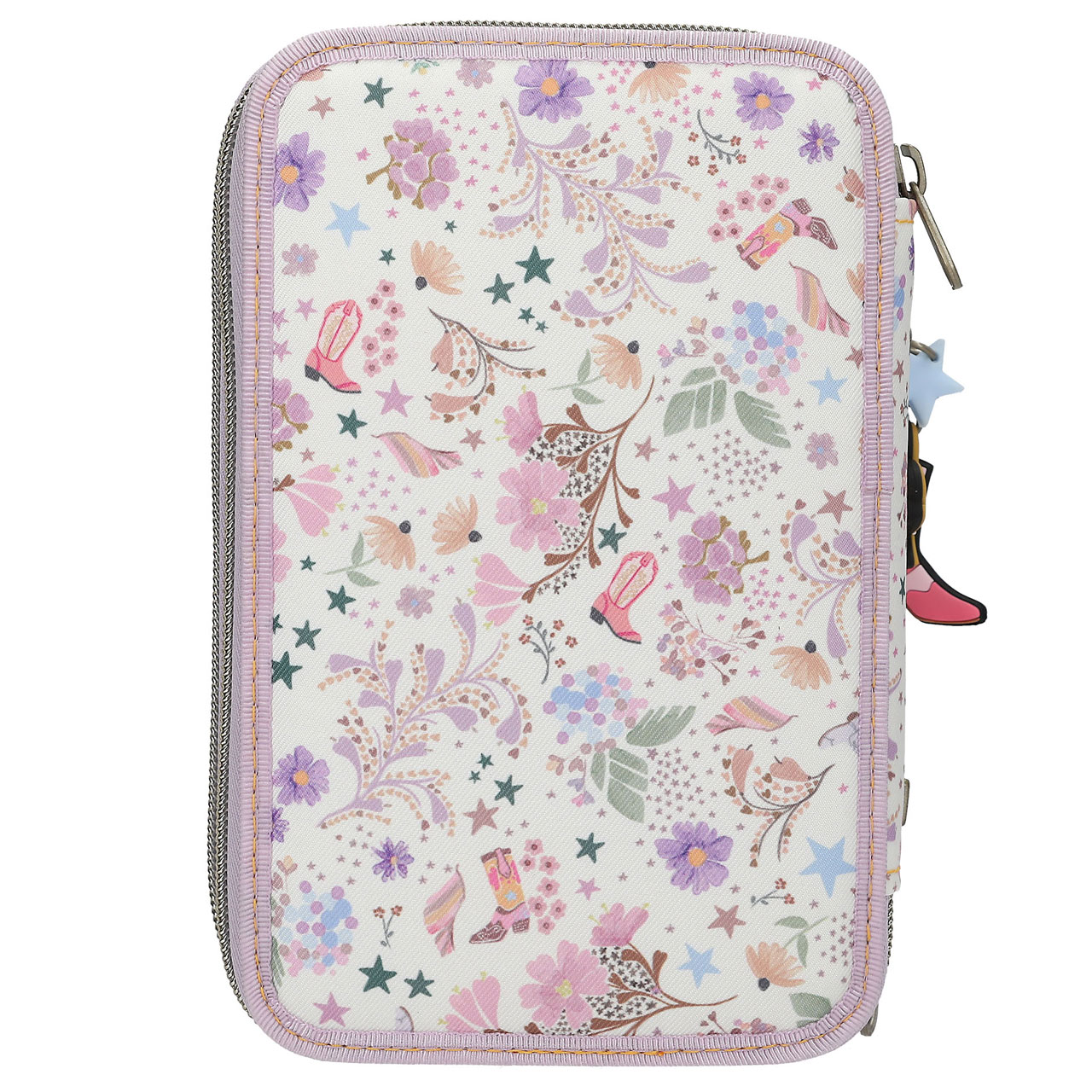 Cowgirl-cool... Die cremefarbene TOPModel-Federtasche mit blasslila Details hat auf der Front ein großes romantisches Model-Motiv mit Gitarre. Rundherum mit einem wunderhübschen, zarten Muster aus kleinen Blüten, Blättern, Sternen und Cowboystiefe...