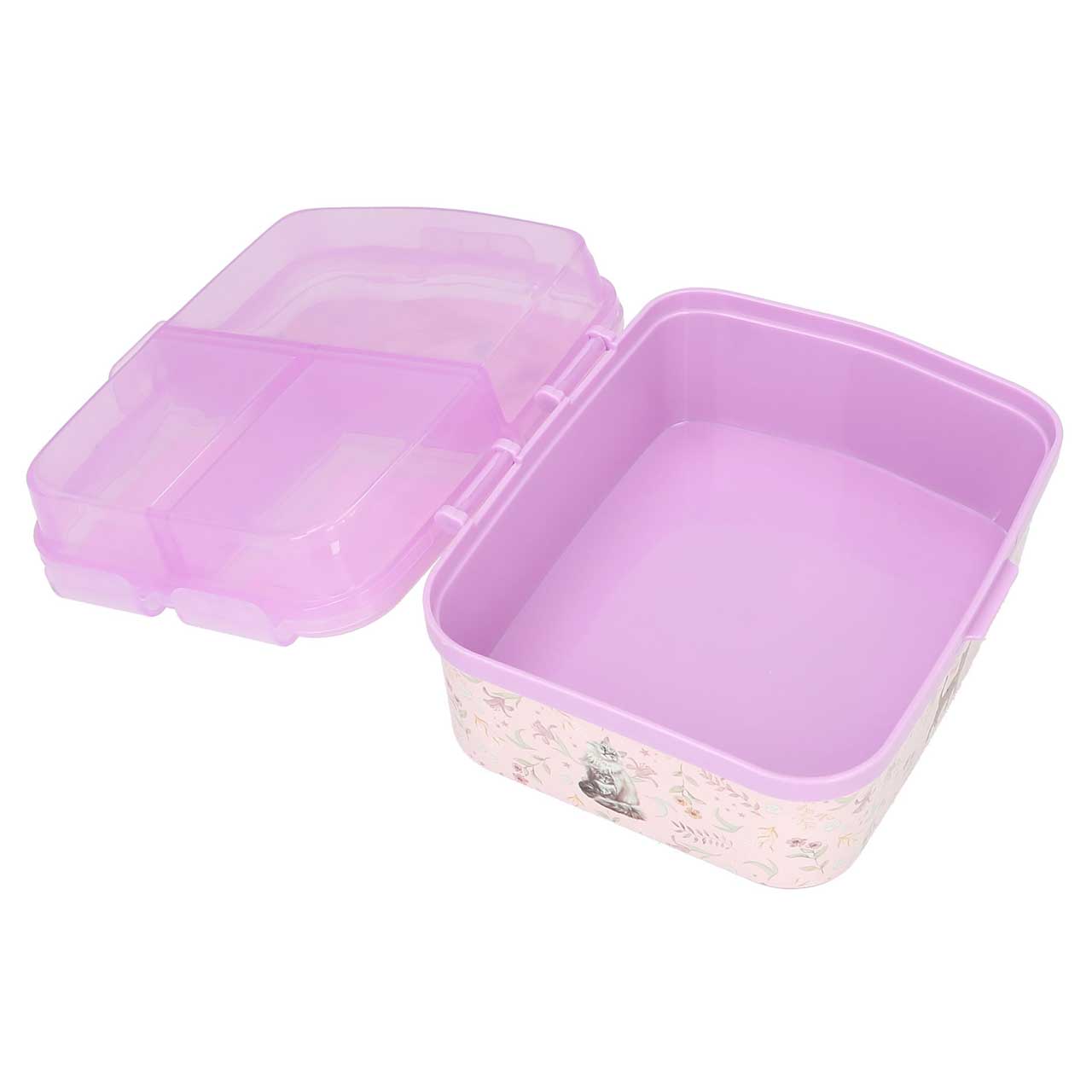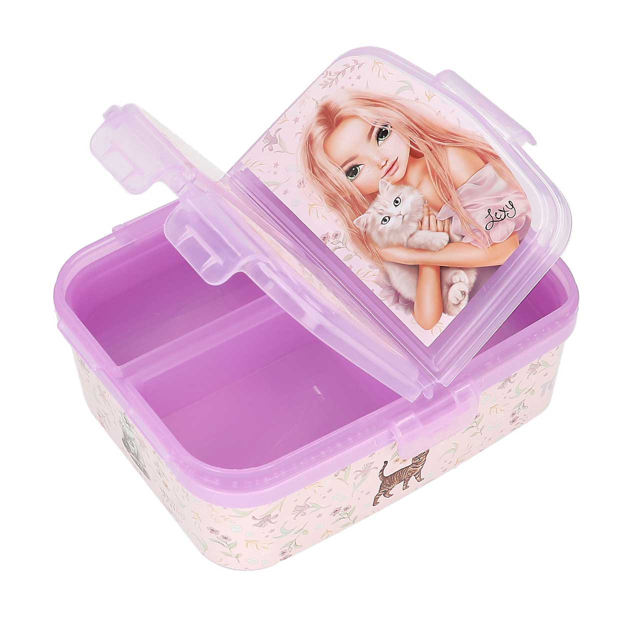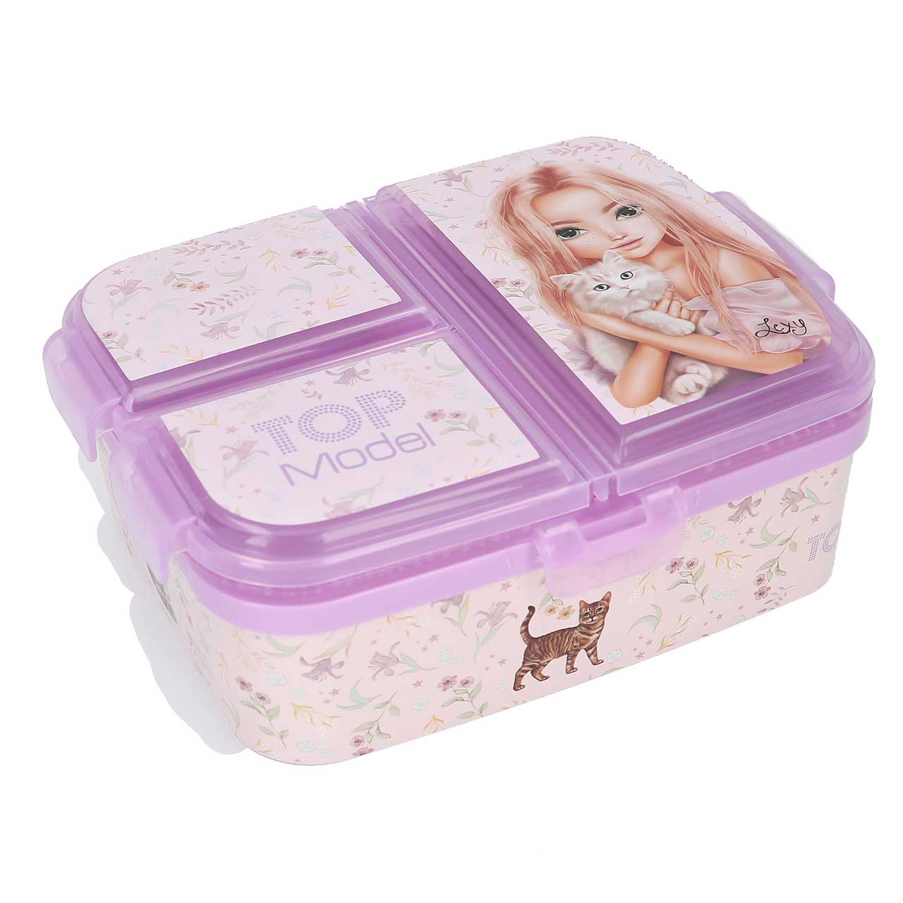 Brotdose mit vier separaten Fächern... Kitty-cool. Die TOPModel-Brotdose mit einem tollen Model-Katzen-Motiv und superniedlichen Katzen und zarten Blumen an den Seiten hat drei separate Innenfächer mit Klippverschluss auf der oberen Ebene und ein ...