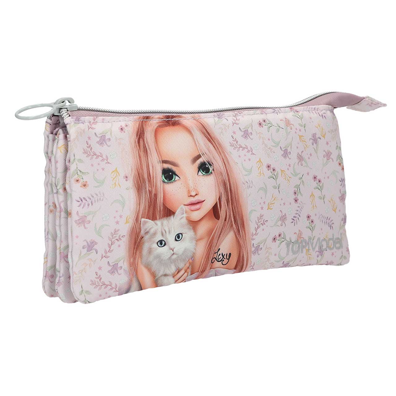 Lila Love. Die TOPModel-Fächerschlampertasche in zartem Flieder hat ein stylishes Model-Motiv mit flauschiger Katze auf der Front und ein niedliches Blumen-Muster im Hintergrund. Unter dem Haupt-Reißverschluss verbergen sich drei separate Fächer, eines mit einem weiteren Reißverschluss. Viel Platz und Ordnung für Stifte & Co. Hauptmaterial: 100 Prozent Polyester.