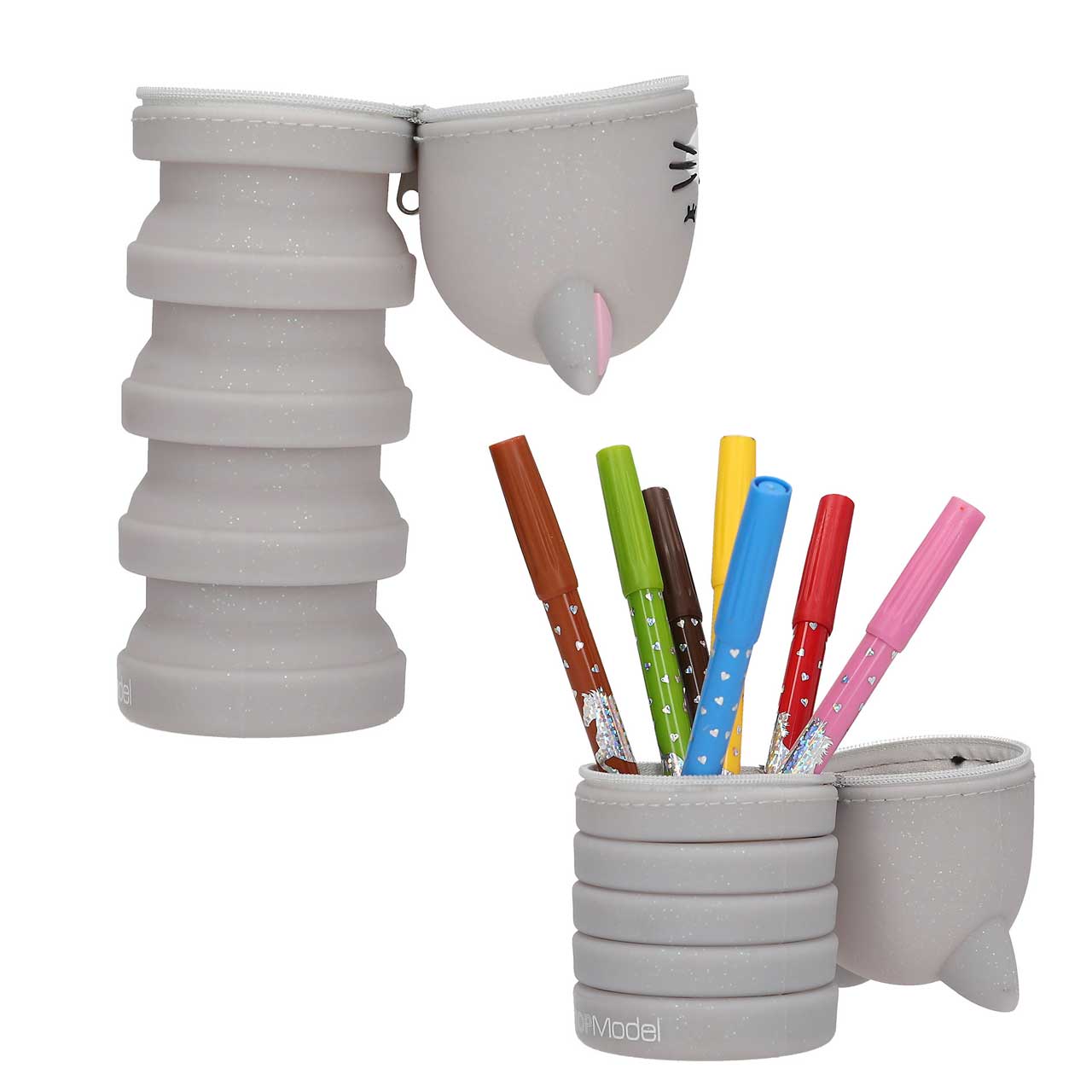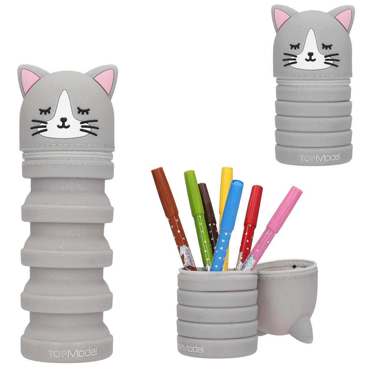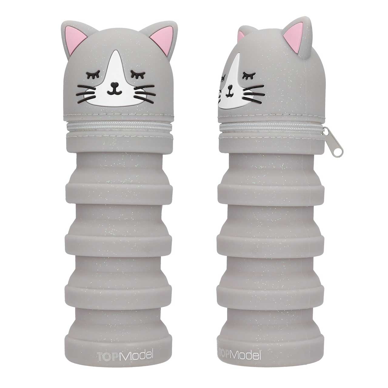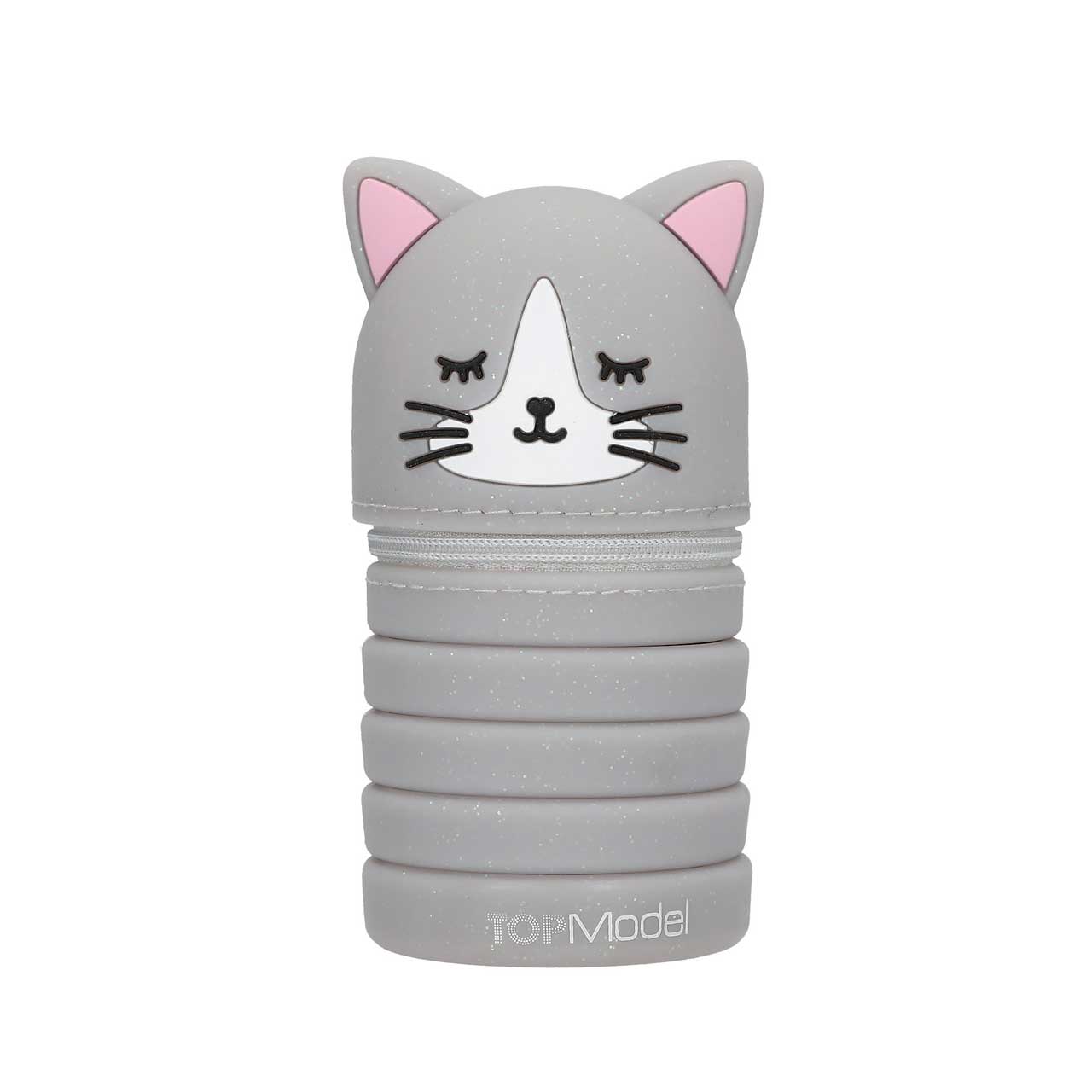 Die Feder-miau-mäppchen von TOPModel lassen sich zusammenschieben und auseinanderziehen, um gut an die Schreibutensilien zu kommen. Das Federmäppchen hat einen Reißvershluss und ein niedlichen Katzenkopf. Es gibt sie in zwei Ausführungen in leicht glitzerndem Grau und Lila. Material: Silikon. Zum Lieferumfang hier gehört 1 Federmäppchen in Grau.